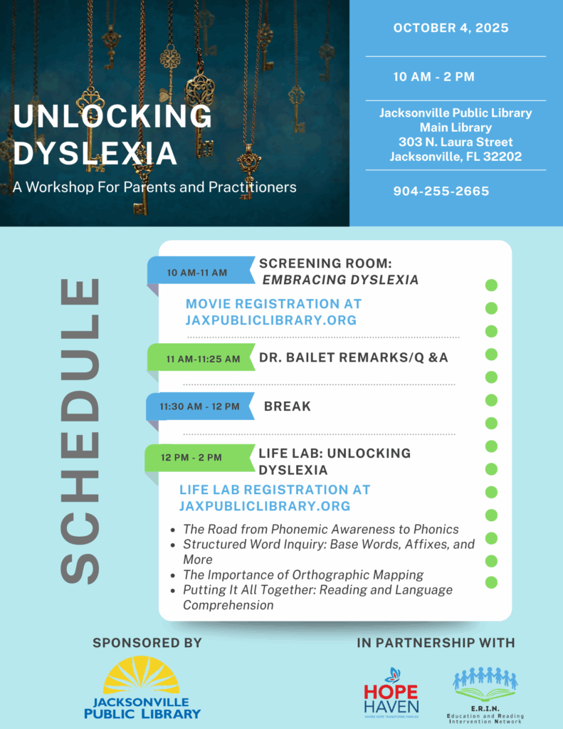 1-2pm M/W Grades 1-5 – Homeschool email dyslexiajax@gmail.com